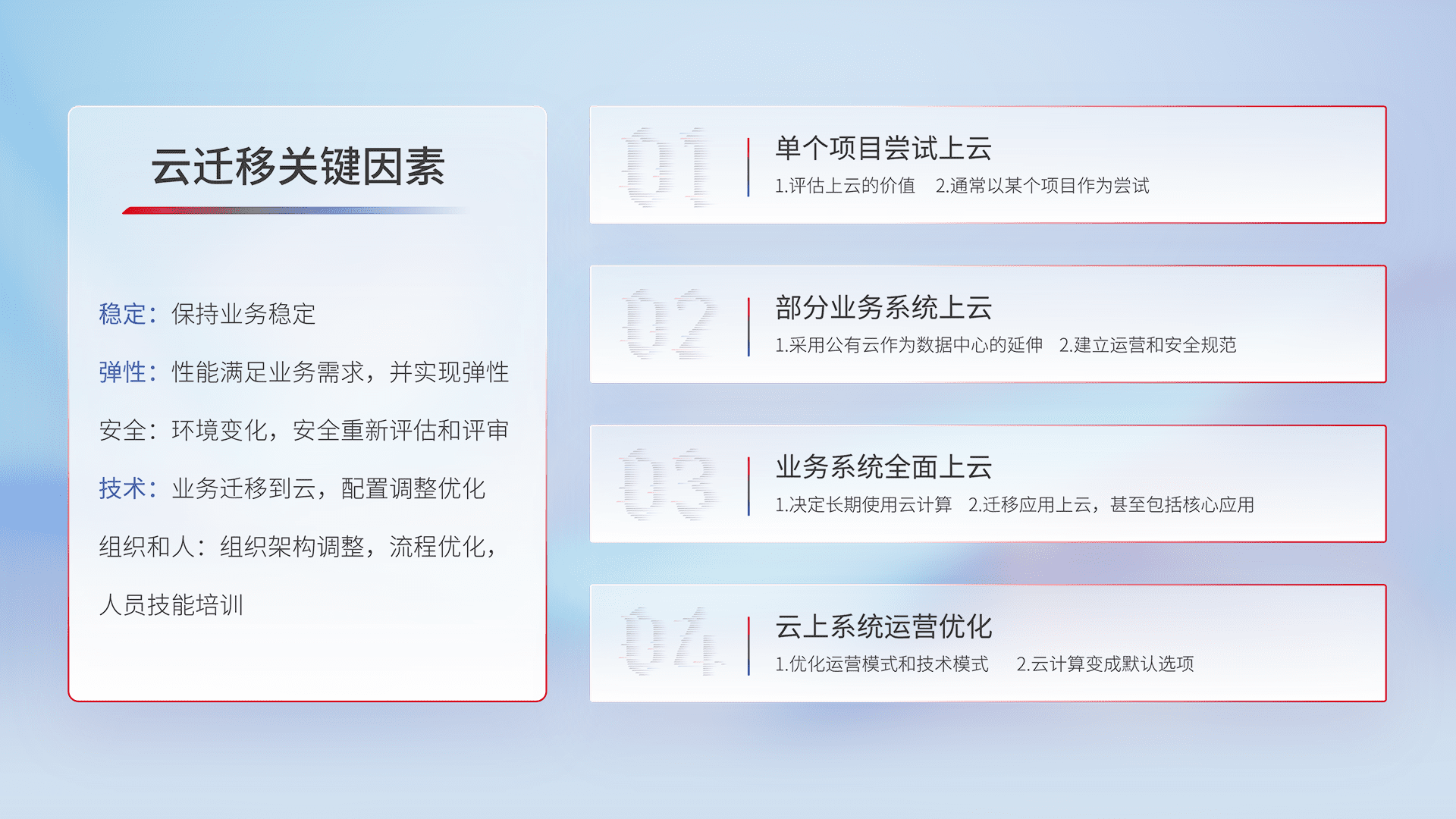 结合实际业务,,,,从规划设计、、、云平台选型、、、、云原生改造、、、、数据迁移、、集成交付,,迁移全过程为客户识别最佳上云路径,,,,做好风险识别管理,,,设计网络架构、、、身份权限、、安全审计合规、、操作审计、、、、日志审计、、监控告警策略、、、多站点容灾设计等,,对云上基础设施进行整体规划,,,,提升IT治理水平,,以满足弹性、、、高可用、、高性能的需求。。
