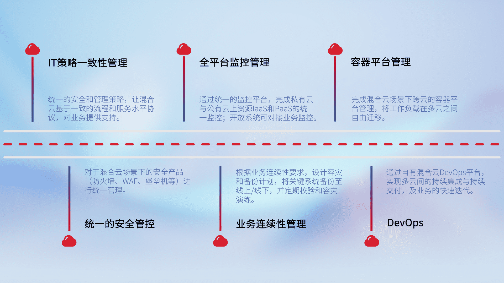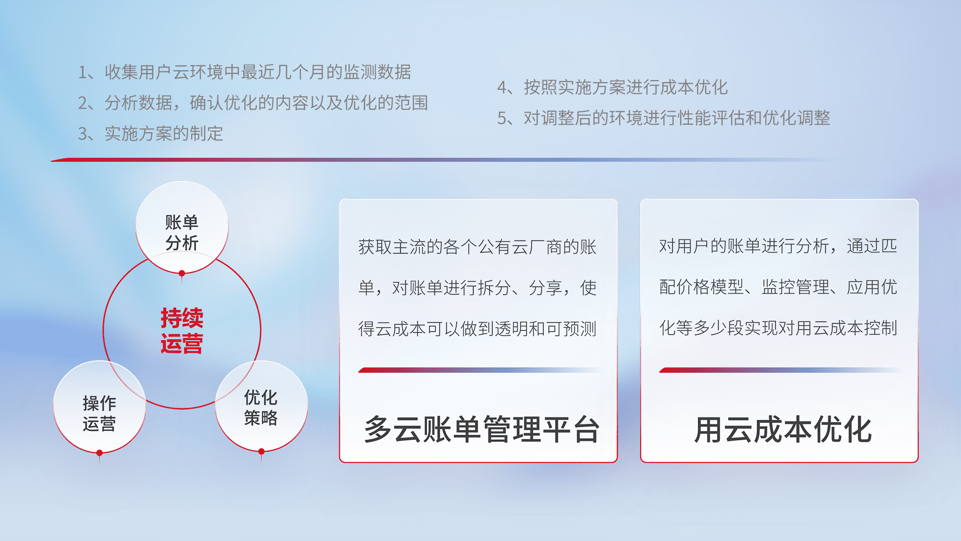通过多云纳管,,,以统一的资源数据模型把客户的云资源进行抽象和封装,,,进而实现对多云资源的统一操作,,,,保障云资源管理的可靠性、、、、稳定性与可用性。。。量身定制化运维内容,,,,配置、、开发运维、、补丁管理、、、备份、、、监控、、、、认证和访问管理、、、、审计和日常巡检等,,保障在用云过程中的可靠度,,,,稳定度以及高可用率。。