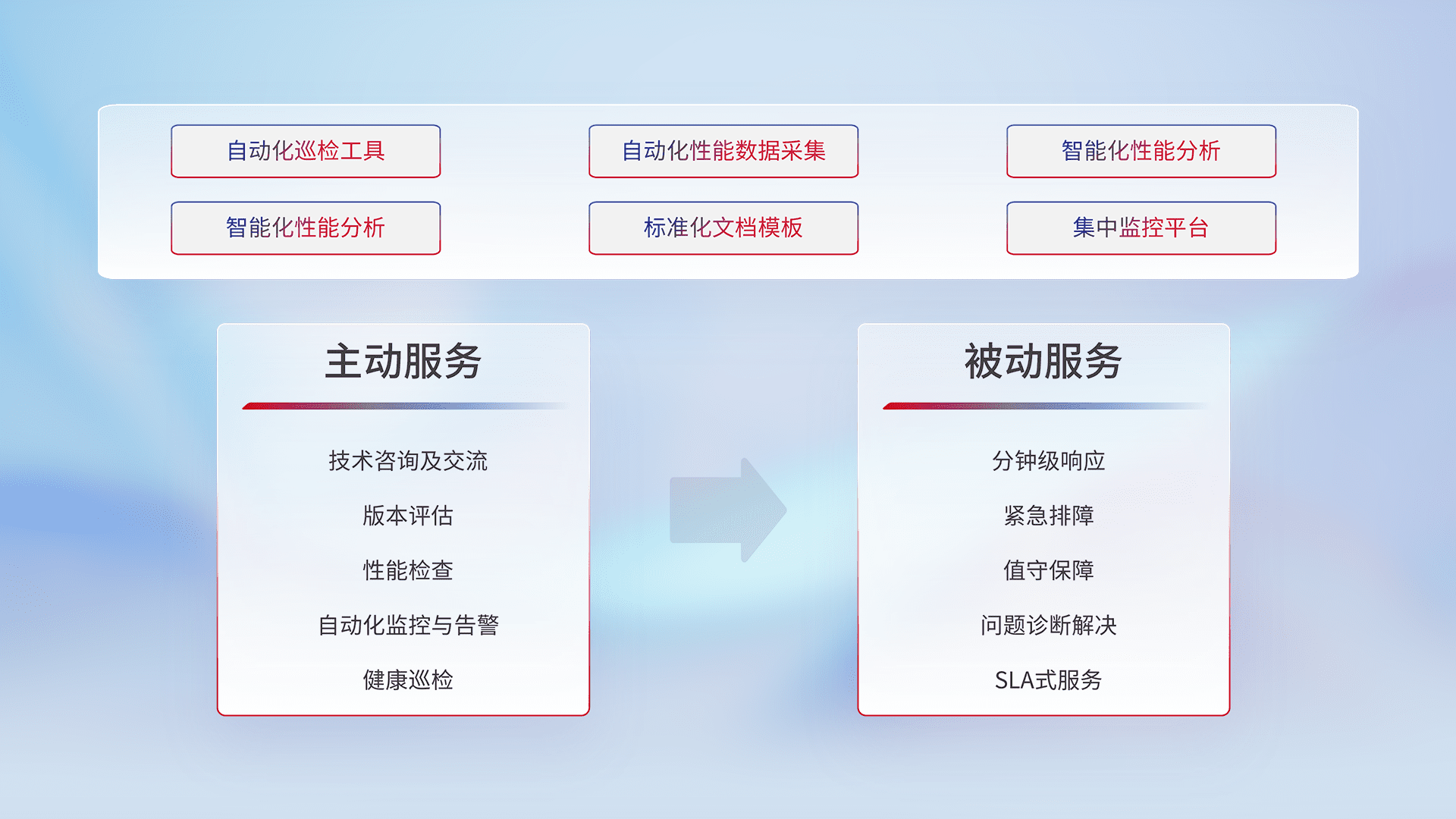 智能化工具和标准化文档,,,,保障服务质量,,,,提供主动服务(包含技术咨询、、、、版本评估、、性能检查、、、、自动化监控与告警、、、健康巡检)和被动服务包含(分钟级响应、、、紧急排障、、、、值守保障、、问题诊断解决、、、SLA服务)。。